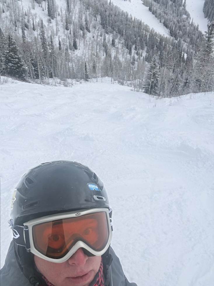 I skied much of the afternoon on Mineral Basin and Mount Baldy before heading back to the front side. Late afternoon I pointed my skis down Gadzook’s — a fairly narrow black diamond with some serious moguls. I was feeling good. Maybe too good. Where it intersects with Bananas below, I eased up thinking I’d level out on the blue cut and collect myself. Instead I hit a bump, went airborne, and came down wrong on my left knee. Hard.