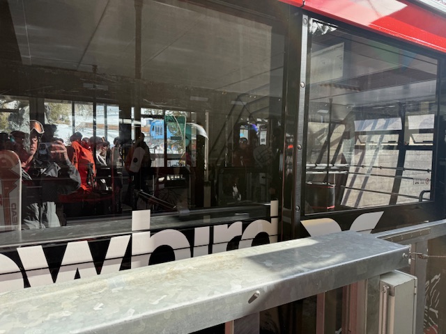 I arrived around 11am, suited up in the parking lot, made a sandwich from the leftover lunch meat still in the Yeti cooler from Winter Park, and caught the bus to the resort. The bus drops at a pedway that runs through a fantastic common area at the base — shops, warmth, the smell of food, a big crowd of skiers  — and I walked straight through it all with my skis on my shoulder to the Steamboat Gondola and rode it to the top.