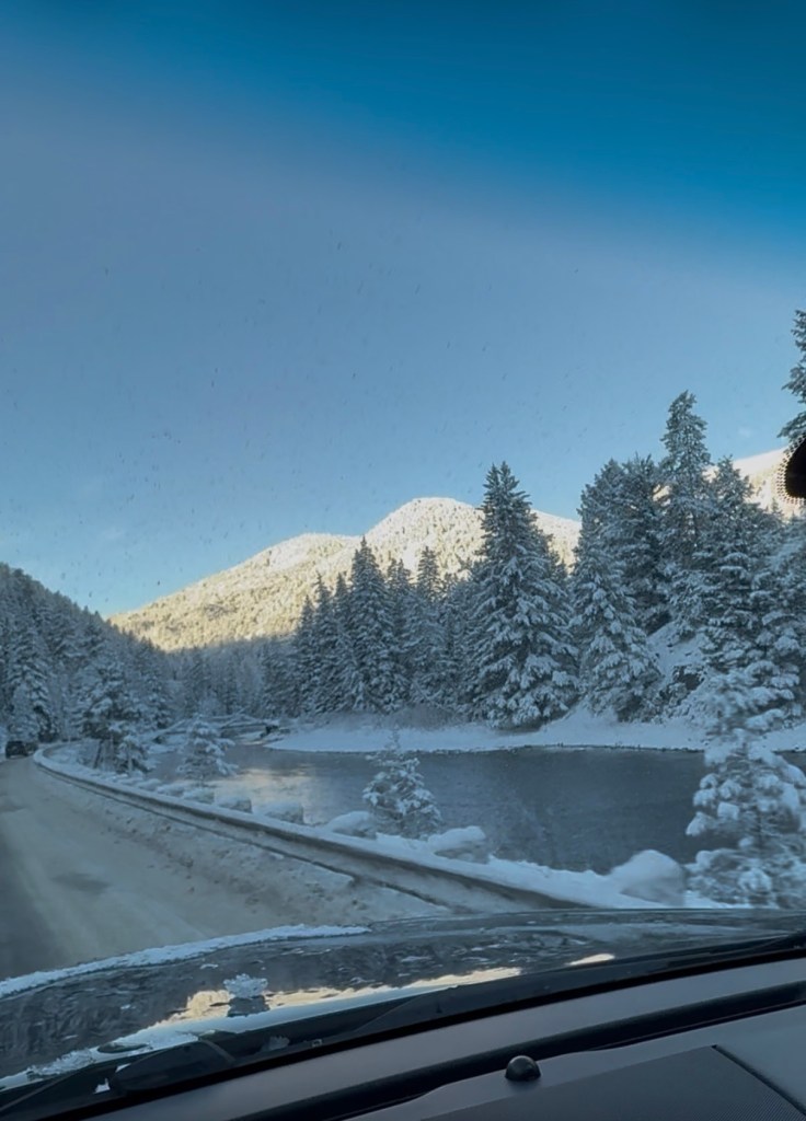 The drive from Bozeman to Big Sky was something else. The Gallatin Canyon road winds up through rock walls and over the river, narrow and dramatic, the kind of approach that makes you think you’re going somewhere hidden —
