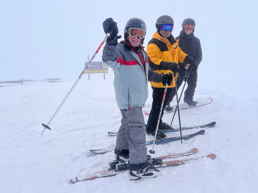 I had no idea where Rick or Thomas were. I couldn’t see five feet. I lay there on one ski at the top of Liberty Bowl in a whiteout and thought: what have I gotten myself into? A skier coming down behind me stopped, picked up my ski, and brought it to me without being asked. I clicked back in, took a hard left, and found my nephew and brother waiting about twenty feet below.